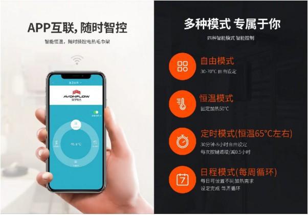 除了语音控制,艾芬达电热毛巾架也支持多种类操作,比如其配置的电热毛巾架第五代温控器,配置4.0超大高清液晶面板,可进行智能触控操作,还可有效防尘防水汽。且能实现电热毛巾架产品与手机APP互联,可在手机上进行“自由模式”、“恒温模式”、“定时模式”、“日常模式”四种模式的温控模式操作,用户可根据需求设定不同的加热模式。此次,与天猫达成了战略合作,让用户可随时随地手机、语音、触控多种方式进行控制电热毛巾架,真正做到智能卫浴“随心所控”。