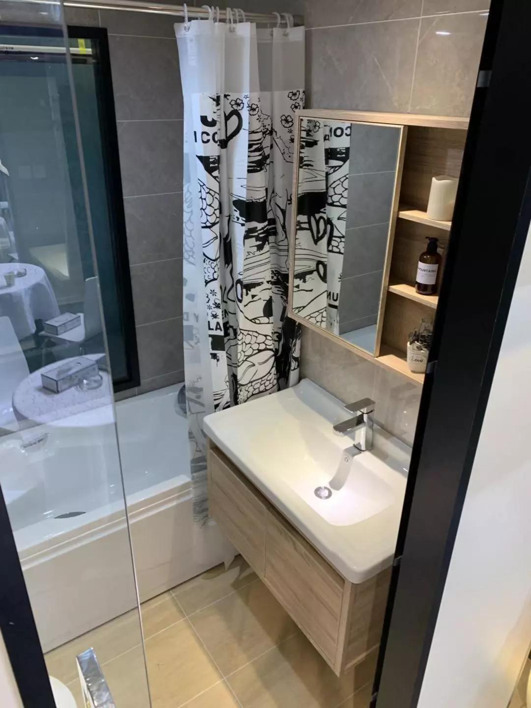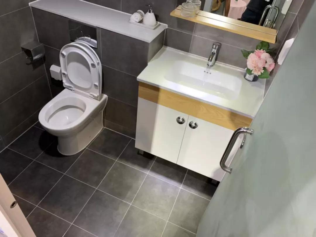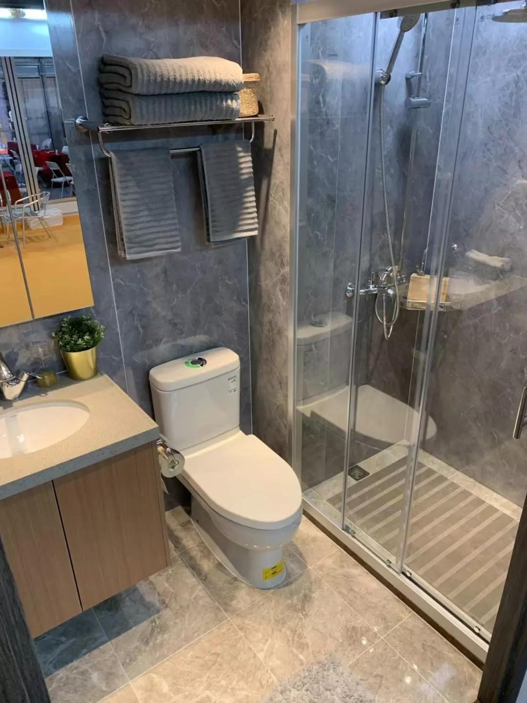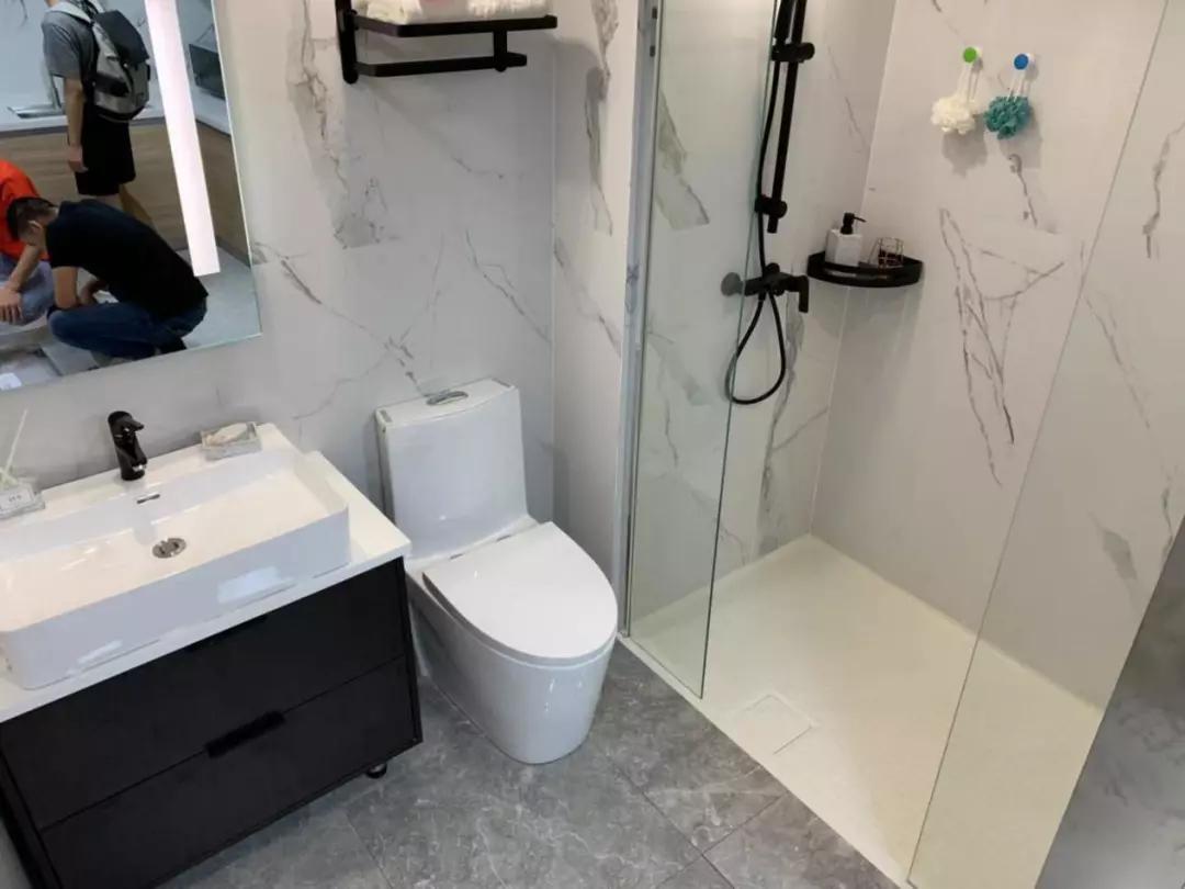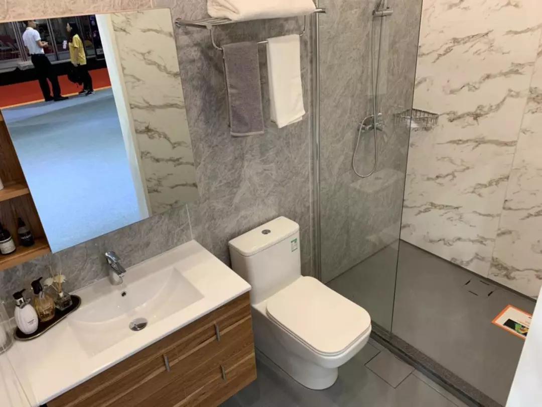 金沙丽是中山的淋浴房企业,今年也携整装卫浴来参展,主题是“完美解决厨卫装修痛点”。该公司展出了多个小户型整装卫浴,使用了GRC材料,墙面则用上了瓷砖。