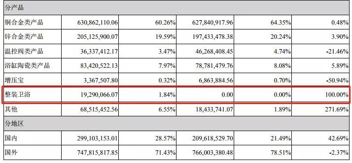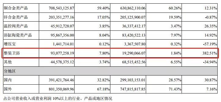 与此相对,上半年海鸥住工其他品类的营收增长率均不高于30%,铜合金类、温控阀类、浴缸陶瓷类分别增长12.31%、26.35%、14.92%,锌合金类、增压宝更分别录得-0.87%和-57.19%的负增长率。海鸥住工在2018上半年报告中首次单独列出整装卫浴业务的营收数字,当时该业务营收0.19亿元,仅一年时间,整装卫浴营收就达到0.93亿元,翻了近5倍。