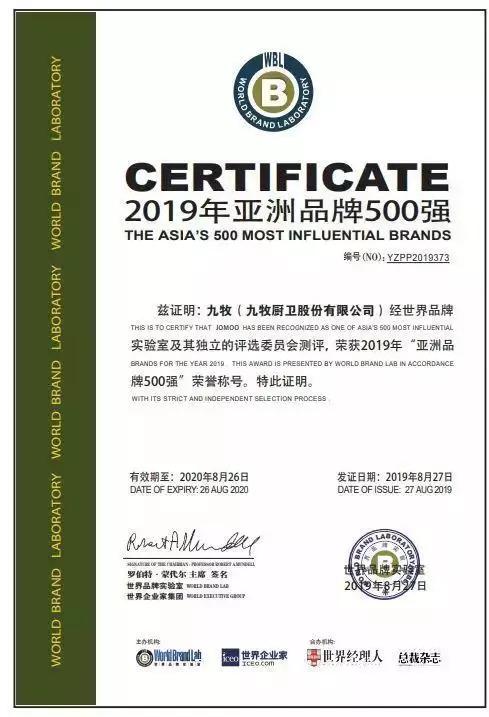 8月27日,世界品牌实验室公布2019年《亚洲品牌500强》排行榜,九牧与腾讯、华为等科技企业入选榜单,九牧稳居亚洲厨卫行业第一。九牧副总裁严桢表示,国际权威机构连续两年将九牧列为亚洲品牌500强,是对九牧在亚洲厨卫高端品牌领导者地位的肯定,也是对九牧品牌国际化的认可。九牧董事长林孝发表示,作为走出国门的民族企业代表,九牧将以身作则为“中国品牌”代言,坚持自主创新,并参与到国际机构、国际标准的制定中,争取国际市场话语权。