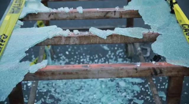 当凉水沾到玻璃,不到2秒的时间,整块玻璃破裂,瘫塌在一地。