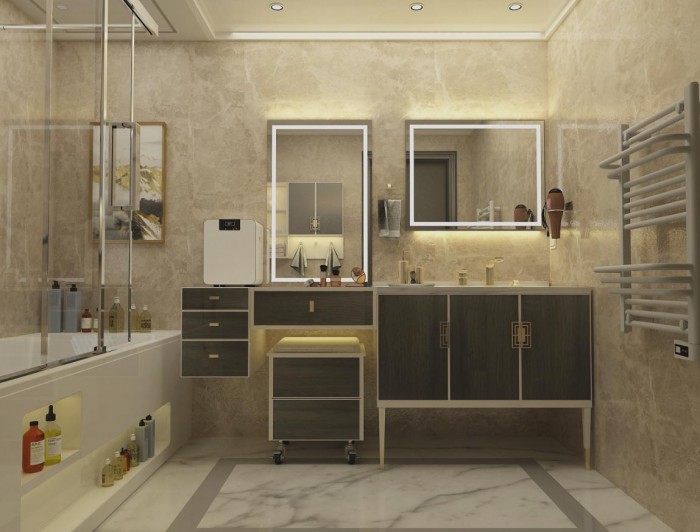 箭牌卫浴对于女性的人文关怀,在品格浴室柜的功能设计上也体现得淋漓尽致。箭牌卫浴品格浴室柜将梳妆台与洗漱台面相结合,搭配了LED美妆镜。缩短了女性护肤化妆以及洗漱的空间动线的同时,还弥补了卫浴间光线不足导致的梳妆问题。上翻式梳妆台能够对化妆品护肤品进行分类收纳,充分考虑到了女性对于浴室柜的个性化需求,并且将其一一具化。三抽式的设计以及可移动式储物梳妆柜,可灵活适应女性对于浴室柜收纳空间的要求。
