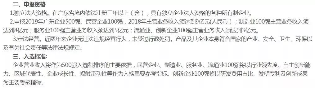 据了解,广东省企业联合会、广东省企业家协会在今年5月发布了《关于组织申报2019年广东企业500强及推荐中国企业500强的通知》,通知对本次申报内容、申报资格、入选标准、申报程序等进行了相关说明。其中,申报2019年广东企业500强、民营企业100强,2018年主营业务收入须达到9亿元(人民币);制造业100强主营业务收入须达到8亿元;创新企业100强主营业务收入须达到3亿元。