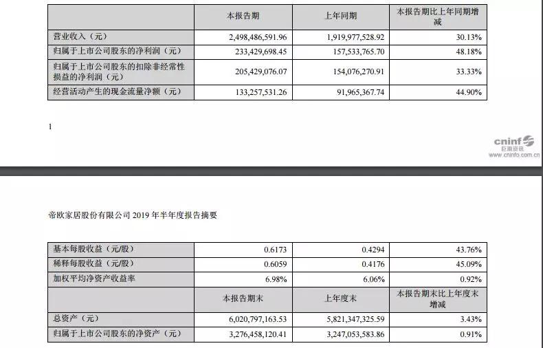 7月30日晚间,帝欧家居披露半年报。公司2019年上半年实现营收24.98亿元,同比增长30.13%;实现归属于上市公司股东的净利润2.33亿元,同比增长48.18%;基本每股收益0.6173元/股。