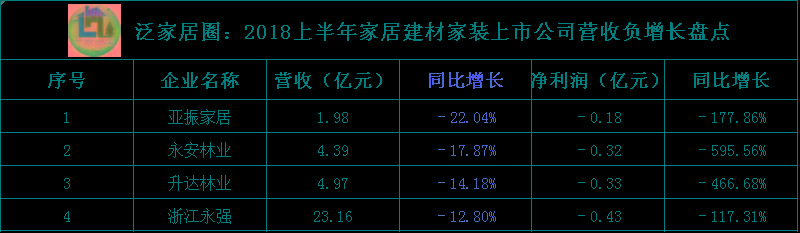 此外,从图表数据可知,2019上半年,各大企业营收负增长的比例在0.43%—22.86%之间,而2018年上半年,相关企业的营收负增长比例则在12.80%—22.04%之间,各企业下降的比例整体感觉有所回升,但不幸的是,营收增长下滑的企业比往年更多了,不得不承认这是行业整体增速放缓的现实。其中,两次均“榜上有名”的亚振家居和永安林业,亚振家居的营收略降,但同比增长比例稍长;永安林业的营收和同比增长都是略微向好态势。