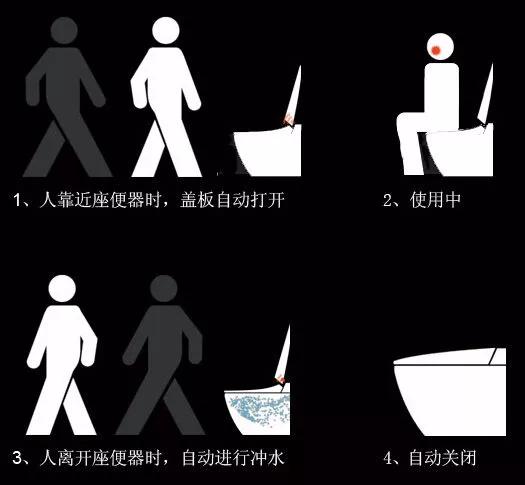 通过红外线感应,人体接近时马桶盖自动打开,离开时自动关闭且冲水。如果卫生间特别小的话这项功能就算了,不然洗个脸它都开来开去也是有点烦人。