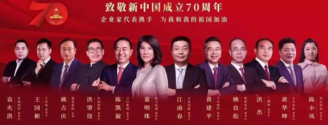回溯新中国成立70年,正是有祖国70年的砥砺奋进,才有我们今年的美好生活。在这振奋人心的时刻,欧派家居董事长姚良松、慕思集团总裁姚吉庆、左右家私董事长黄华坤、马可波罗董事长黄建平等在内的国内12位企业家代表,受邀为《我和我的祖国》加油,致敬新中国成立70周年。