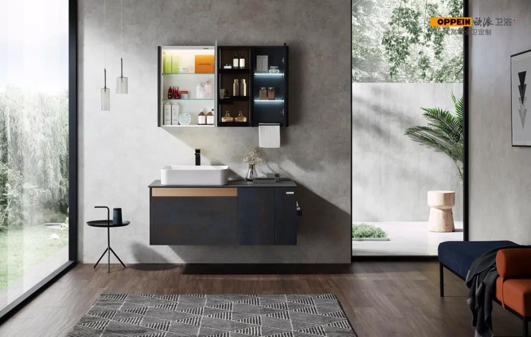 极简风浴室柜采用最新岩板材料,还特别配置集线盒、百隆一体抽,集时尚与功能与一体。