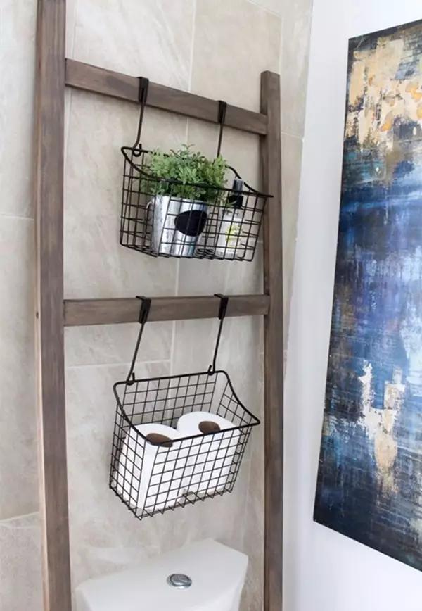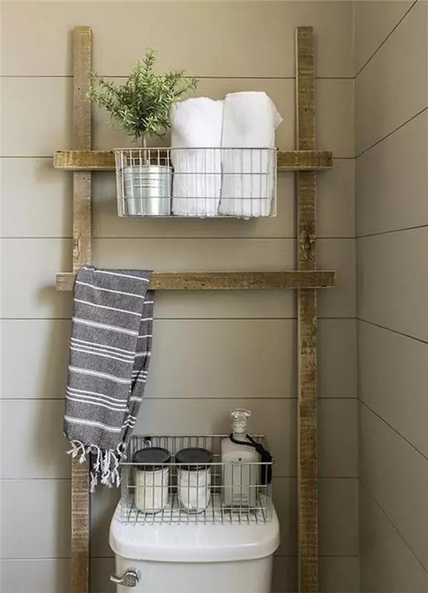 如果你觉得上面都比较麻烦,那么可以选择摆一个小梯子在马桶上方,靠墙安放,不会占用过多的空间,收纳毛巾等很是方便。