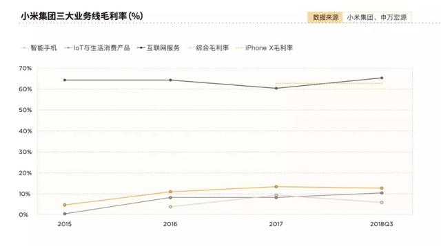 而从小米集团的公开信息和申万宏源的研究数据来看,小米手机、IoT 与生活消费品毛利率均不到10%(主要毛利来自于互联网服务),而苹果的iPhone X手机的毛利率达到了64%。