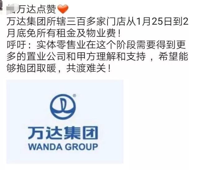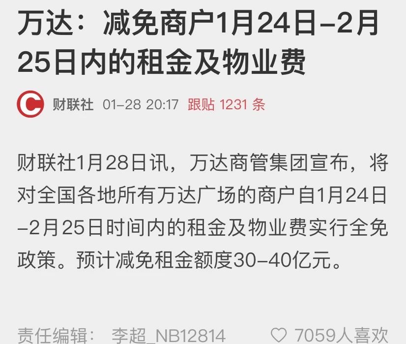 1月28日晚间,万达商业对外宣布,将免去全国所有万达广场的所有商户1月24日-2月25日合计33天的租金及物业费,保守估计,这次免租额度在30亿-40亿之间。