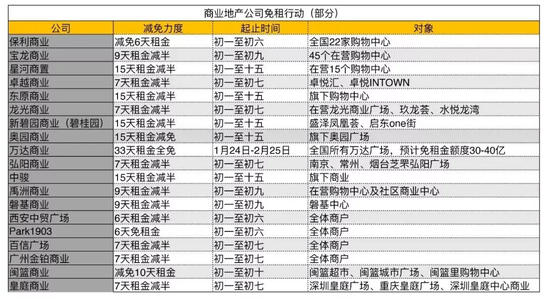 此外,据可靠消息,除了万达商业外,包含保利、宝龙、东原、龙光、禹洲在内的多家房企旗下商业也纷纷减免租金。