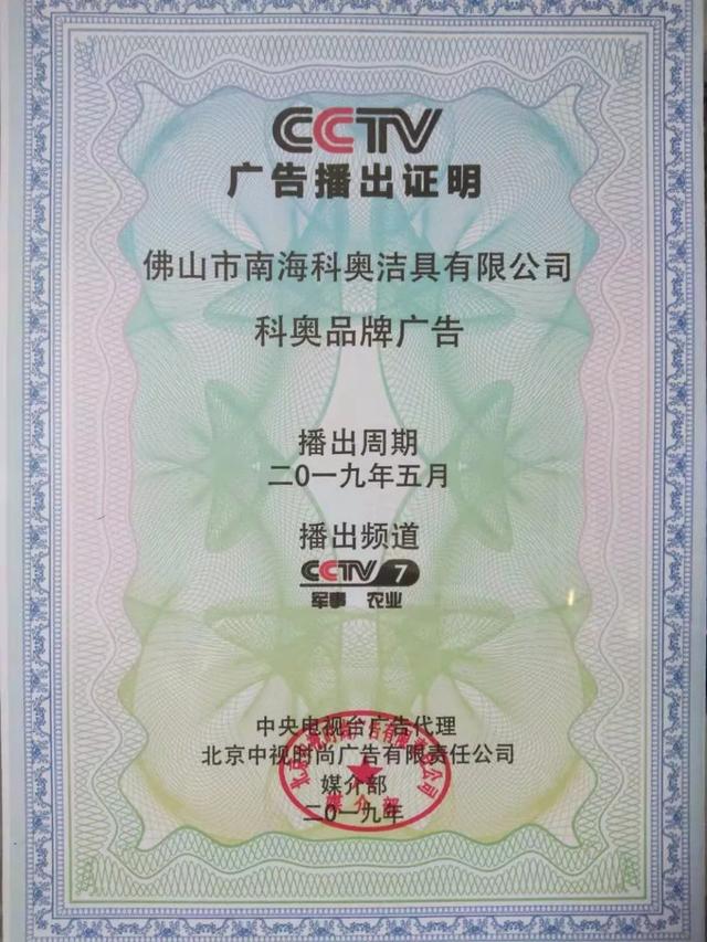 2019年,5月13日到19日,科奥卫浴广告宣传片成功登陆央视,用品牌实力扩展了市场影响力,用产品赢得社会各方的认可。