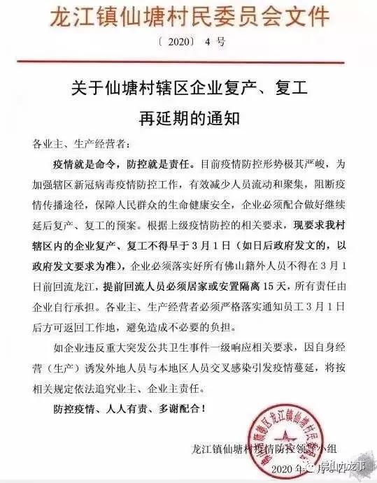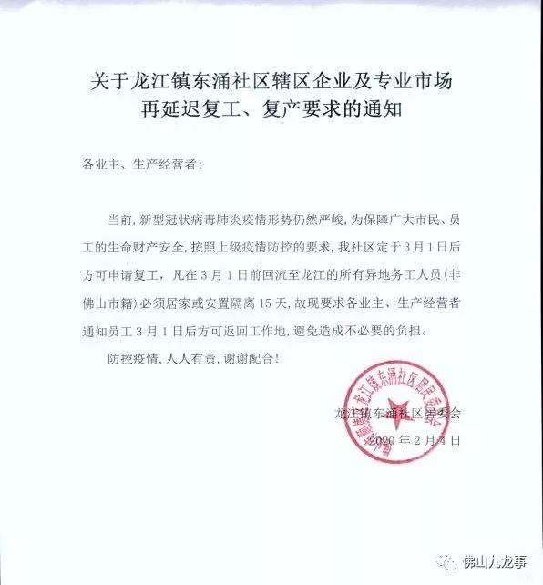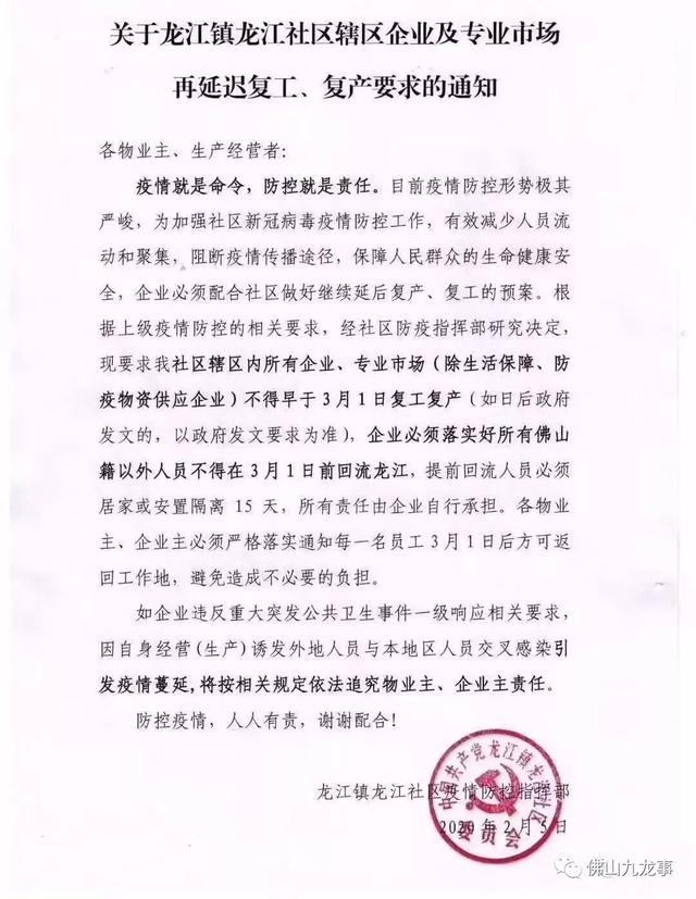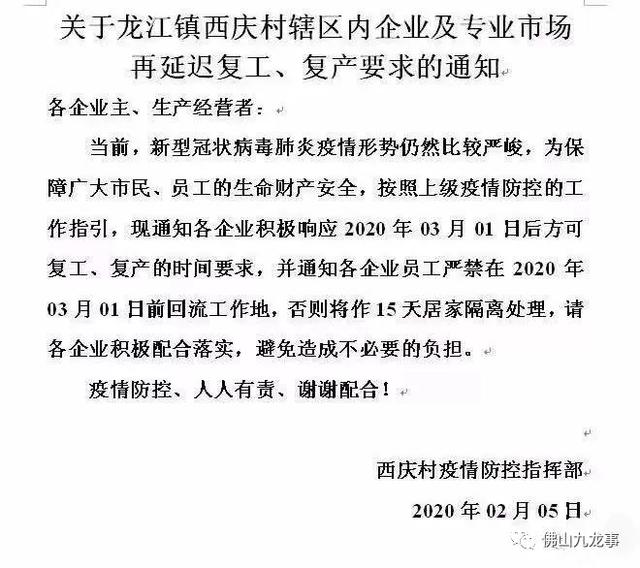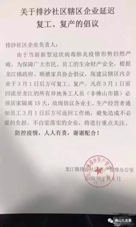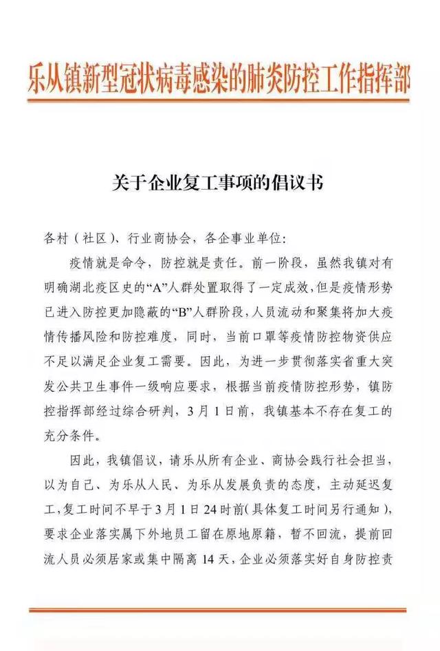 2月5日,位于佛山市的乐从镇发布关于企业复工事项的倡议书,倡议辖区企业复工、复业不早于3月1日24时。
