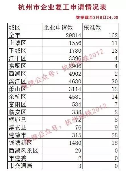 杭州市企业复工申请29814家,核准162家,