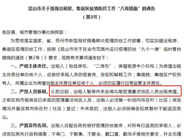 即日起,出租人暂停向来自湖北等疫情重点地区人员出租房屋。之前在我市租房且已来昆的疫情重点地区人员,出租人必须第一时间向所在村(社区)报告情况并督促其向所在村(社区)登记;未来昆的,出租人必须明确告知其暂时不能返回昆山。