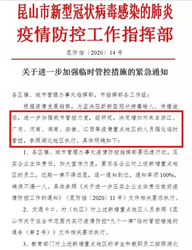 2月8日,昆山市新型冠状病毒感染的肺炎疫情防控工作指挥部发布《关于进一步加强临时管控措施的紧急通知》。