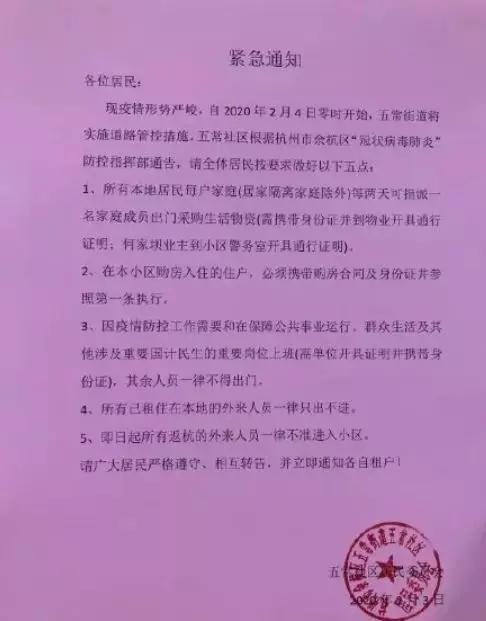 所有已租住在本地的外来人员一律只出不进;即日起所有返杭的外来人员一律不准进入小区。
