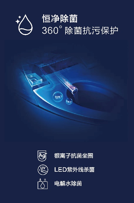 恒洁Q9、Q10智能一体机搭载的银离子抗菌坐圈、LED紫外线杀菌、电解水除菌等相关除菌/洁净卫生技术,能够有效抗菌,降低病毒传播风险,洁净无忧,更好呵护家人的健康。