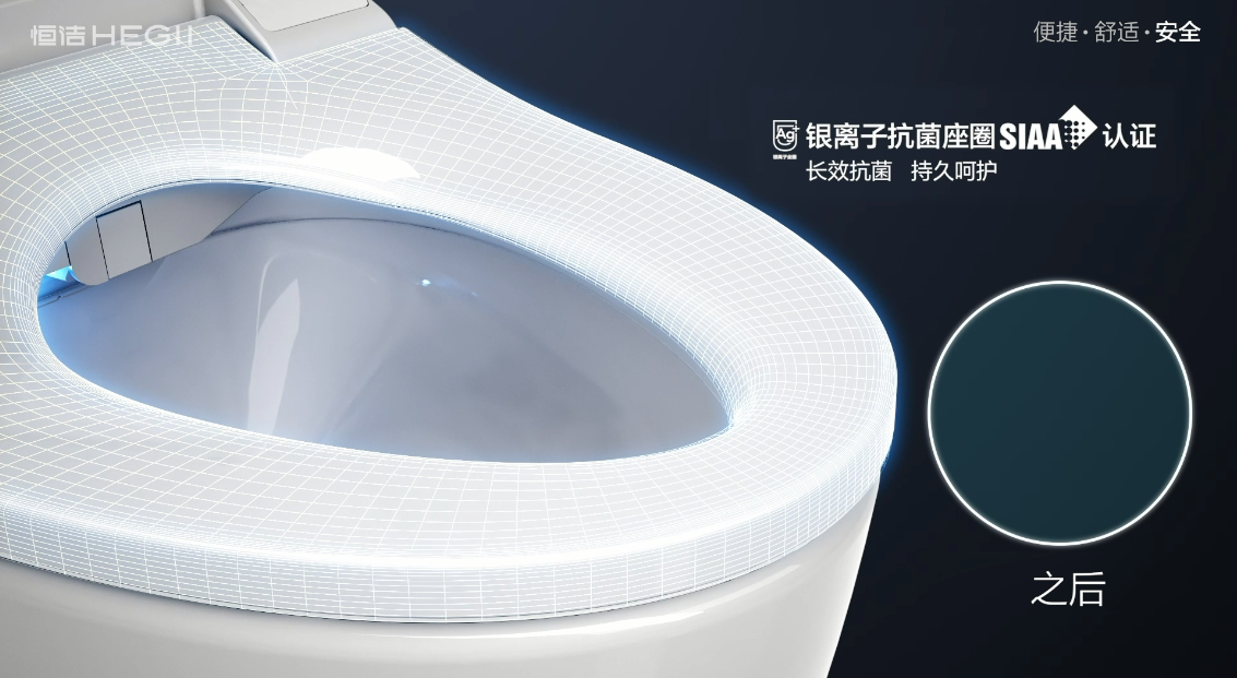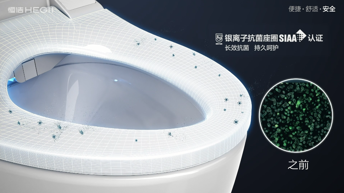 恒洁Q9、Q10智能一体机,在国内首家使用经过日本抗菌协会认证的SIAA银离子抗菌座圈,有效抑制座圈表面细菌滋生,提供长时间的抗菌环境,长效稳定,长时间使用依然洁净自然。