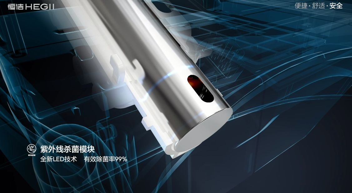 恒洁Q9/Q10智能一体机采用先进的LED紫外线杀菌技术,隐藏式的紫外线灭菌灯利用一定波长的紫外线改变微生物的DNA结构,杀菌率高,不产生有害物质,通过简单的照射可有效杀灭99%的细菌。