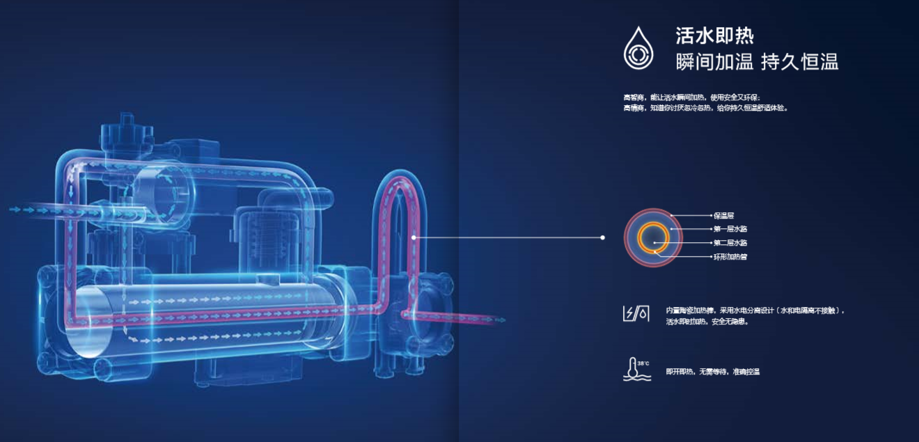 恒洁智能一体机采用活水即热技术,可以减少细菌滋生,活水注入瞬间加温即热持久恒温,清洗水时刻保持新鲜,确保干净卫生。