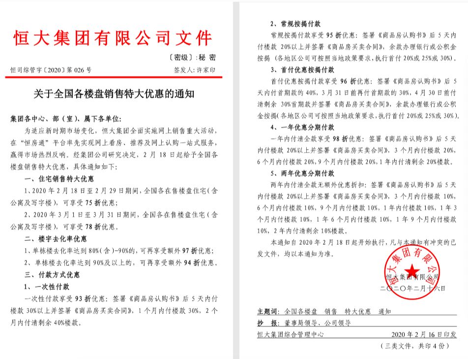 昨天(2月16号),一份由许家印签发的恒大集团《关于全国各楼盘销售特大优惠通知》的红头文件流出。
