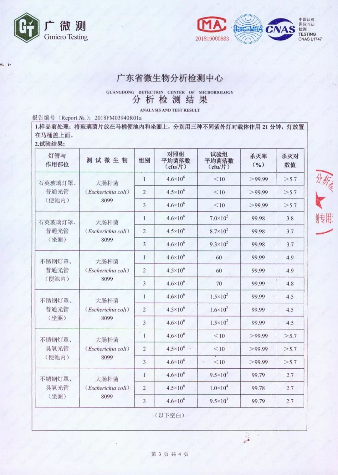 广东微生物检测中心的检测报告测验,朝阳卫浴光波UV智能马桶对大肠杆菌等细菌的杀菌率高达99.99%。权威认证,为消费者安全护航!