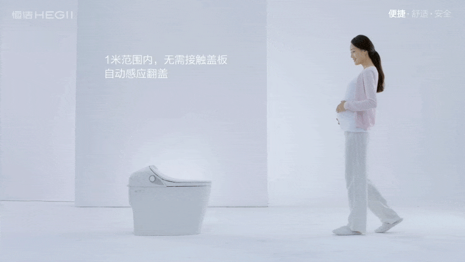 恒洁Q9/ Q10智能一体机采用雷达微波感应技术,在设置为自动模式的状态下,当你正面靠近时盖子会自动打开,无需弯腰触碰盖板,即可轻松使用。除此之外,你还可以拿起遥控器操作翻盖、坐圈,同样无需接触,便捷安全。