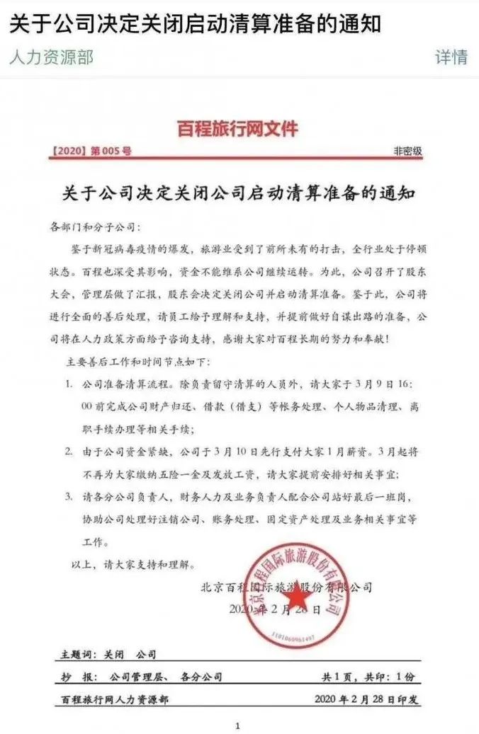 没办法,现金流断了,又找不到新的资金进来,只能宣布倒闭。就像百程旅行网那份广为流传的《关于公司决定关闭公司启动清算准备的通知》中所说:受新冠疫情影响,百程资金不能维持公司继续运转。为此,公司将进行全面善后处理,请员工给予理解和支持,并提前做好自谋出路的准备。请所有员工在3月9日16:00点前完成公司财产归还等事宜和手续。