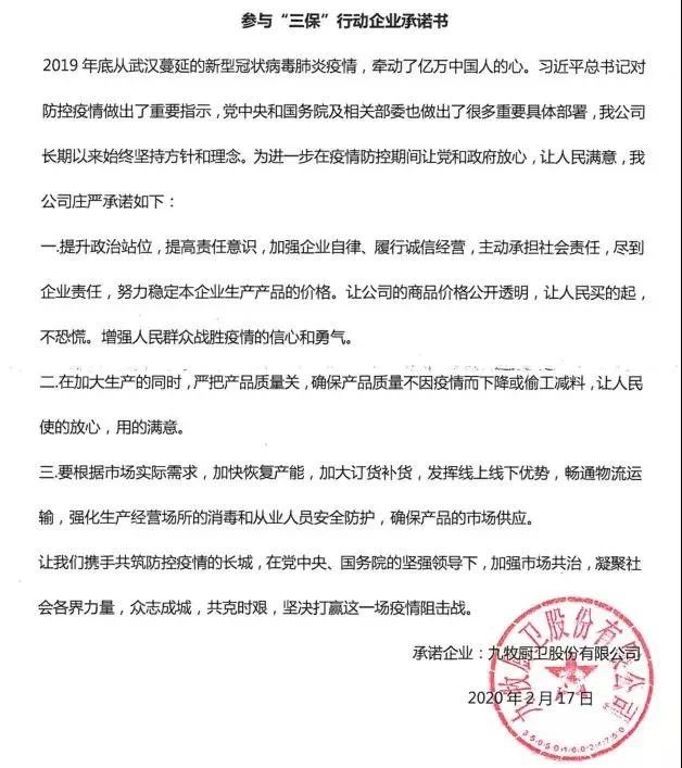 市场监管总局局长、党组书记肖亚庆指出,推动企业庄严公开承诺保价格、保质量、保供应,有利于疫情防控期间全社会稳定预期、增强信心、同舟共济、凝聚形成疫情防控全社会合力。九牧始终将民族品牌责任担当扛在肩上,放在心上、落到实处,不遗余力贡献自己的智慧与力量,为人民带来更美好和健康的生活而不懈努力。