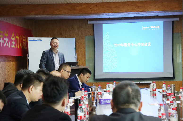 12月是2019年最后一个月,也是全体尚高人员廛战的一个月,面 对年底收关之战,国内营销团队于12月3号,在公司总部召开了2019 年业绩冲刺动员会,尚高卫浴总裁、国内营销中心销售部和市场部总监、各事业部负责人以及全国服务中心总经理参加了本次会议。