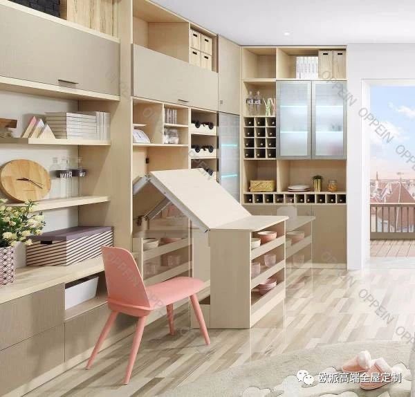 2、餐边柜旁边增加一个书桌,上面打组合柜子,厨房中融入吧台元素。这样不仅可以一边做饭,一边照看孩子做作业玩耍,增加家人之间的沟通。