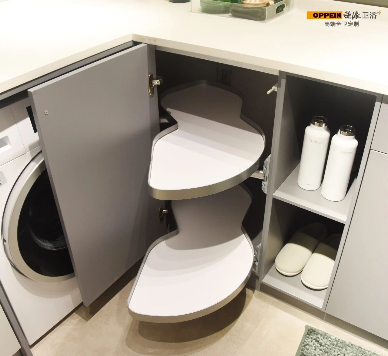 转角飞碟拉篮 转角空间大,难以利用,拿取不方便,利用双层飞碟设计拉篮,巧妙旋转拉出,操作灵活,合理利用空间,使用井然有序。
