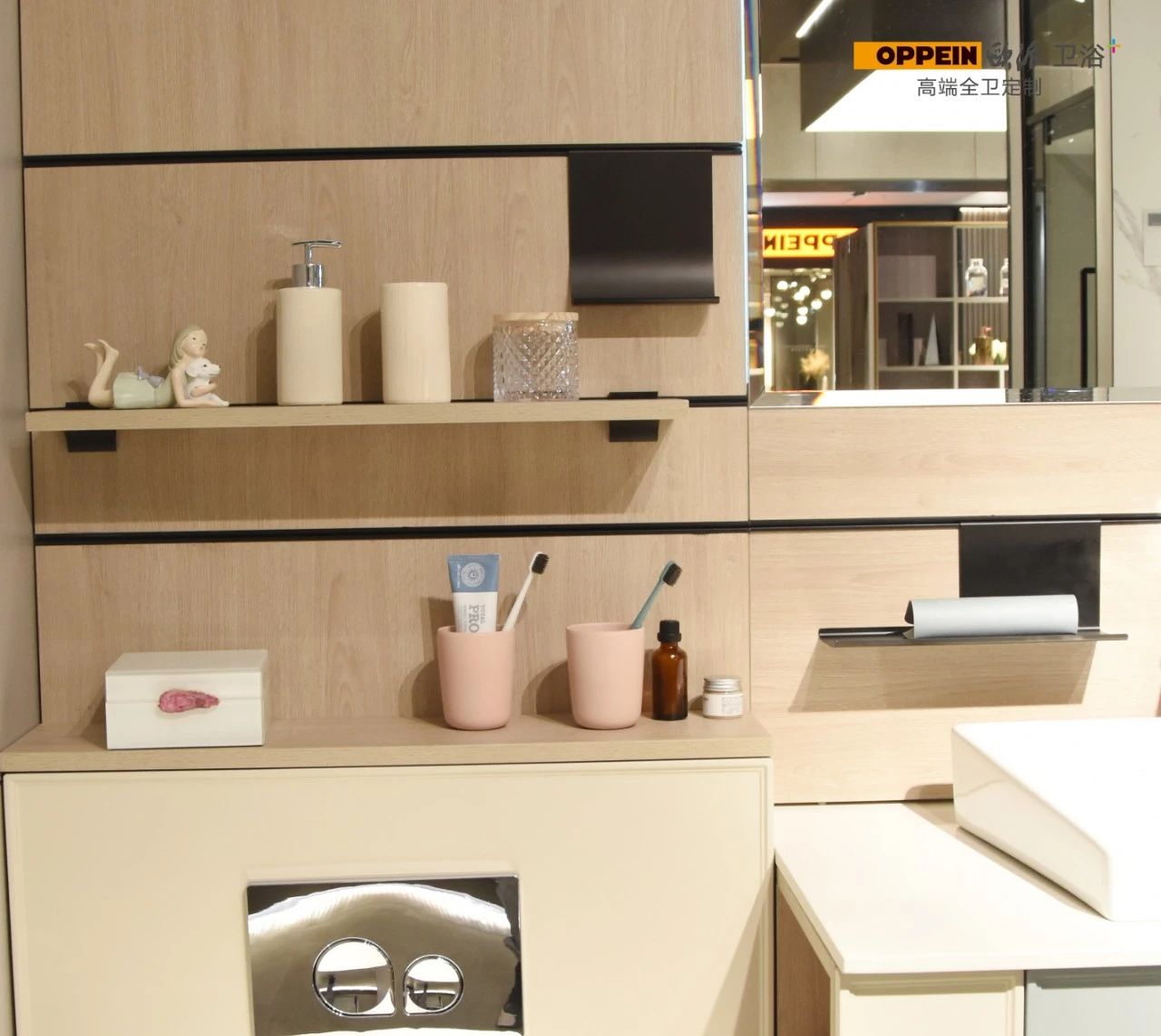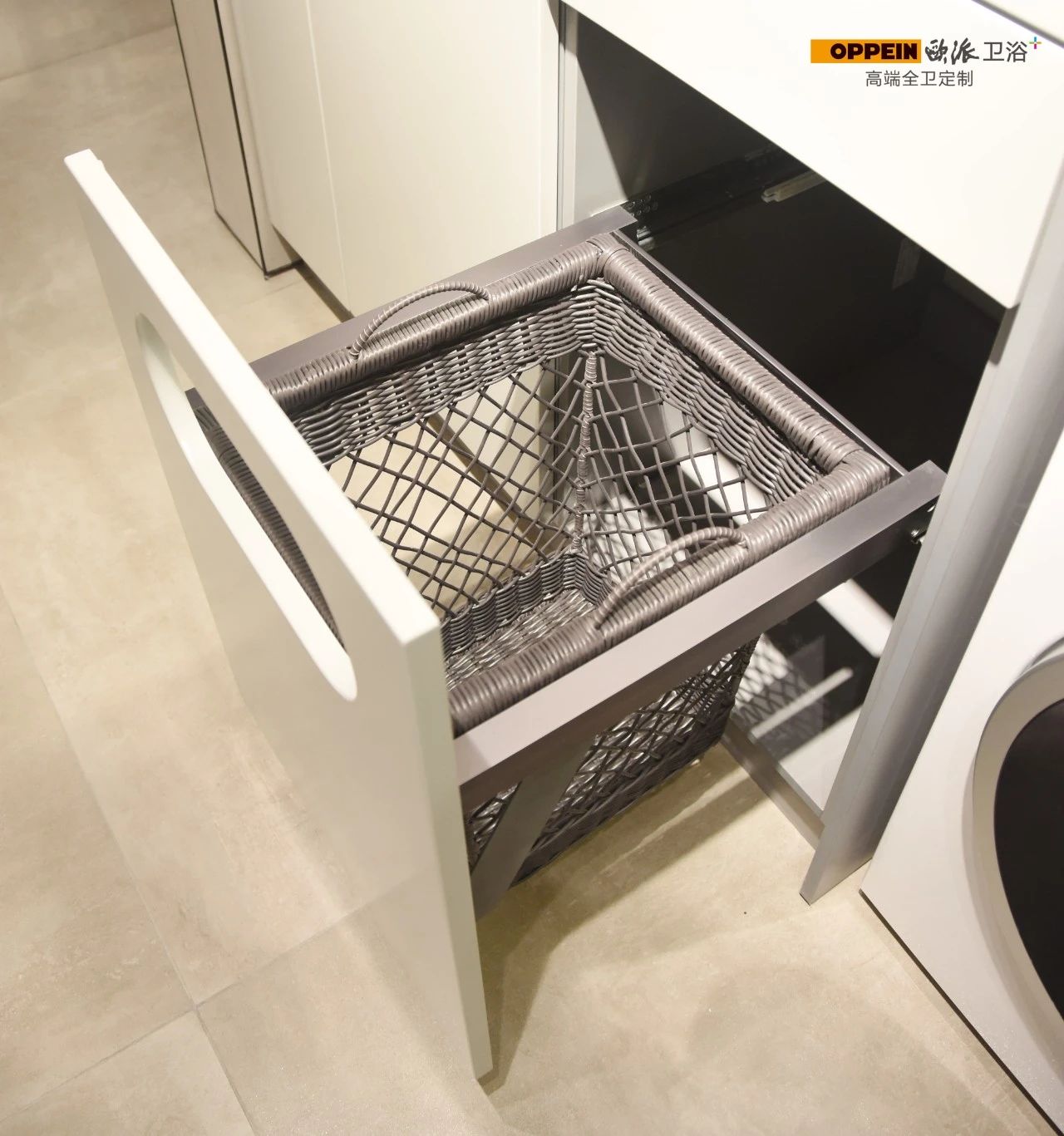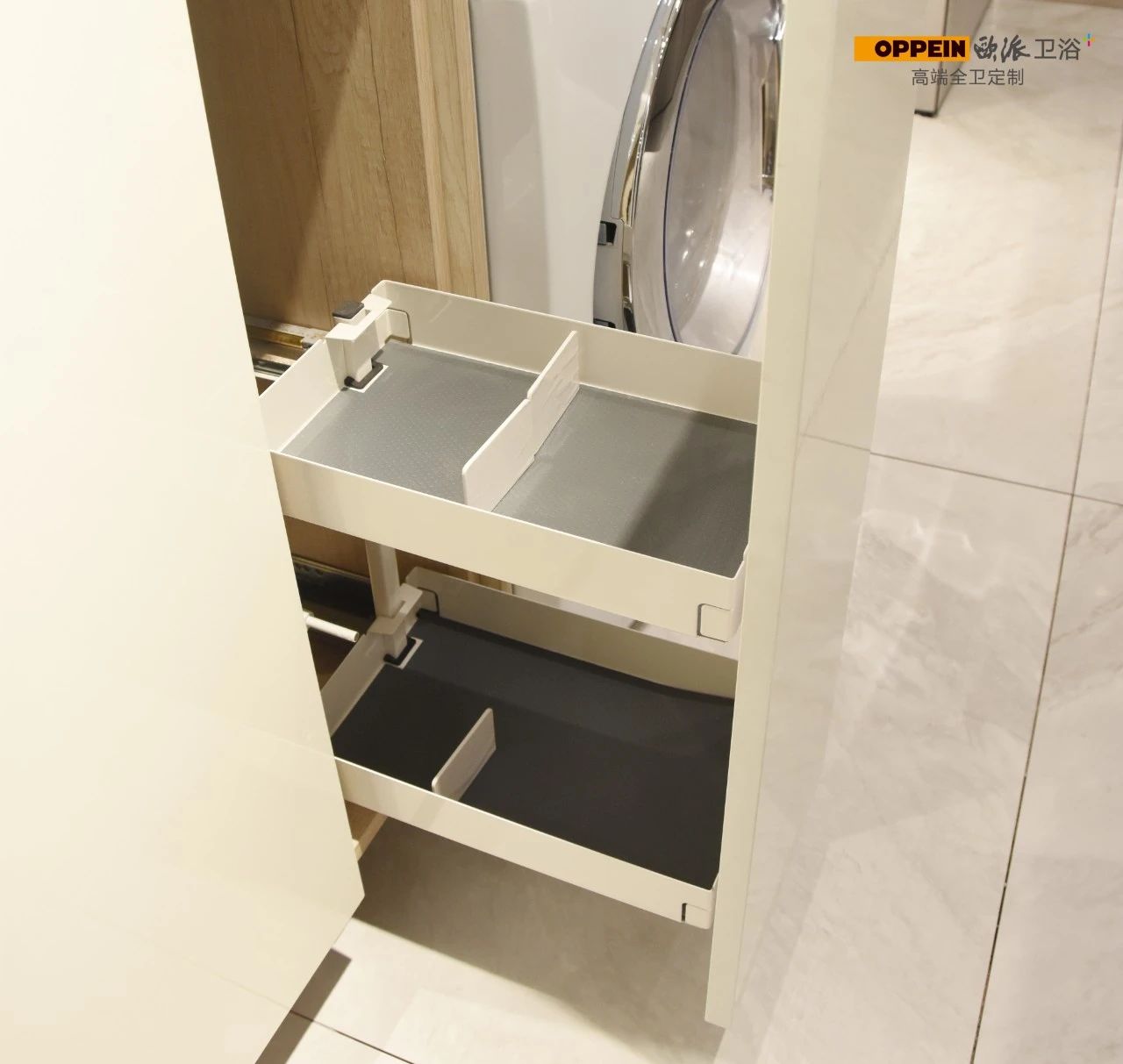 门后拉篮 利用洗手台下空间,巧妙打造收纳专区。拉篮上下分层设计,收纳盒可自由取放,适合放置零散小物,整理有序,不显杂乱。