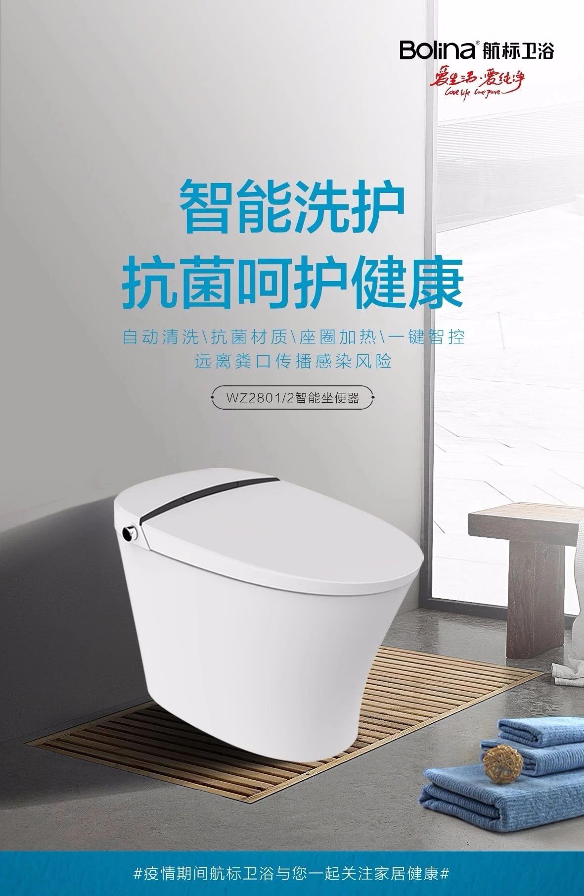 航标WZ2801/2智能马桶具有在用便过程中启动自动除臭的功能装置,洗护采用的喷嘴自动清洗技术且采用的材质具有良好的抑菌效果,人体接触的座圈均采用了抗菌材质,且座圈具有多档温度可调加热功能,集齐了多重有益于健康的保护措施。一键智控自动清洗和自动离座冲洗、遥控启闭座圈等智能装置,有利于减少频繁接触产品,远离细菌。由于马桶冲水时存在一定的气体挥发,建议用完马桶后立刻冲水,同时闭上马桶盖板。