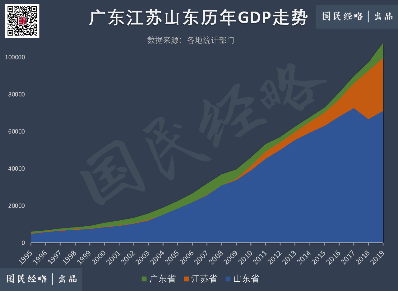 1978年,广东GDP仅位居全国第五位,不及上海、江苏、辽宁和山东。从1980年代,广东开始追赶之路,一路向上攀升,自1989年超越山东、江苏首次登顶之后,一直到2019年,连续30多年位居中国经济榜首之位。
