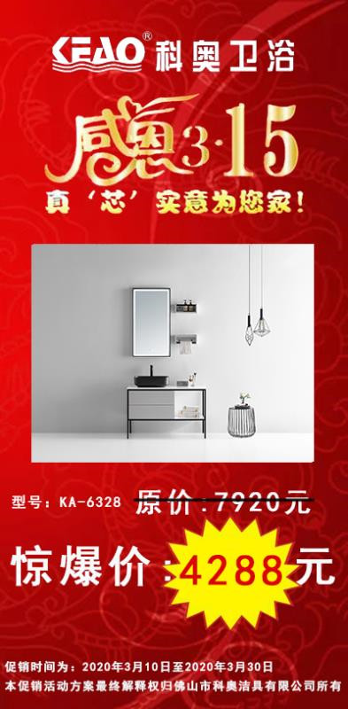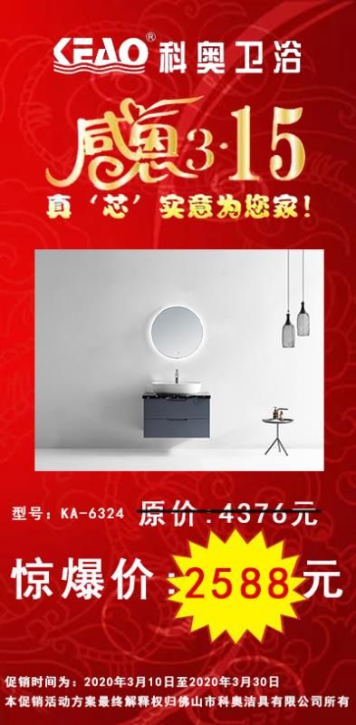为了回馈广大客户一直以来的支持与信赖,科奥专门打造了一场让客户放心的“感恩3·15,真芯实意为您家”的促销活动,多款产品好物皆有消费者满意的价值。3.15期间,科奥卫浴全国各店面都享有优惠促销活动,大家可千万别错过啦!