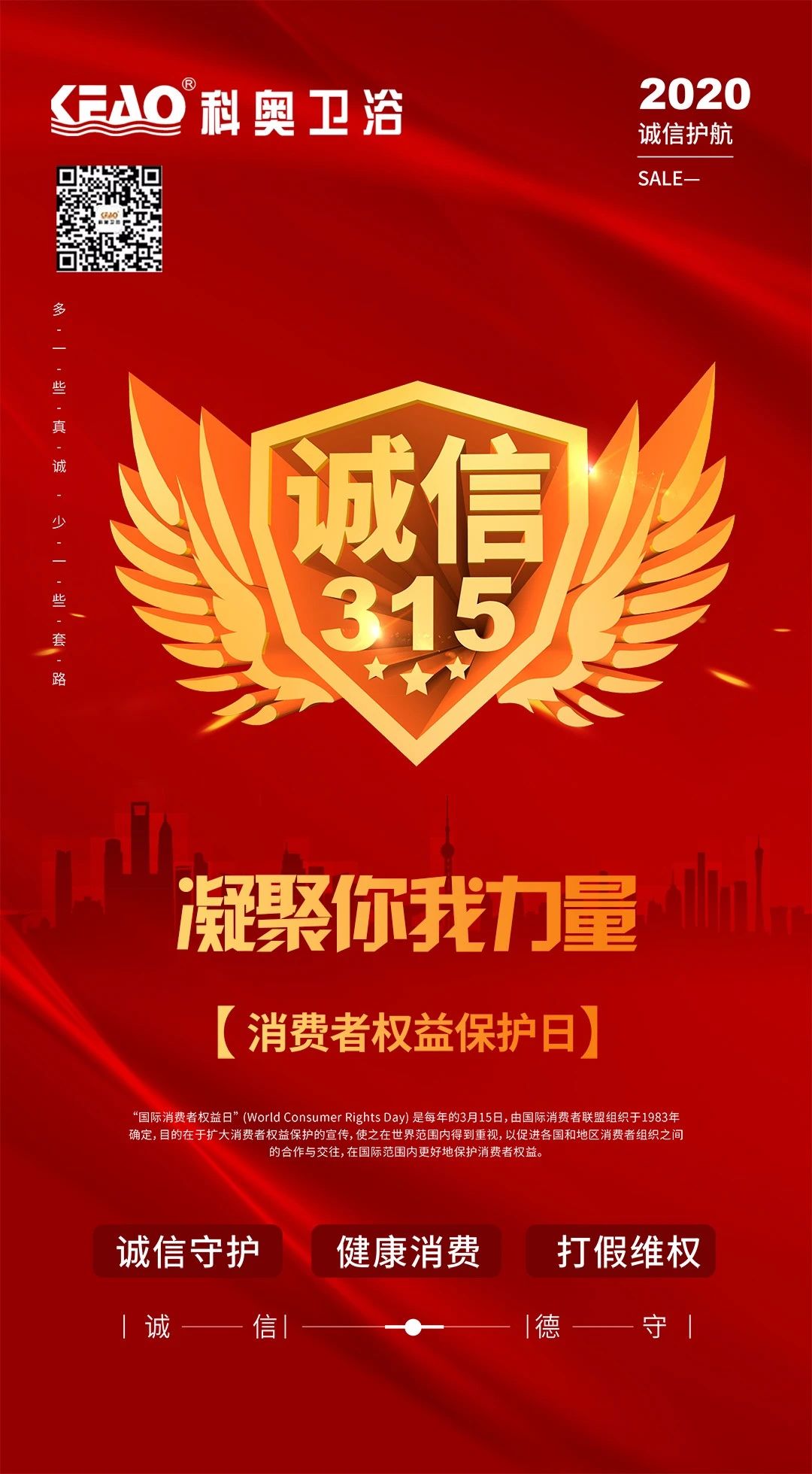 质量和诚信工作是一项长期的战略任务!科奥卫浴质敬315,以15年来始终恪守品质、专注匠心的好产品,对广大消费者做出郑重承诺:2020的维权主题与科奥的理念不谋为何,科奥产品均采用环保板材制作,设计风格简约低调、清雅大方,为广大消费者提供更高品质的浴室柜产品!