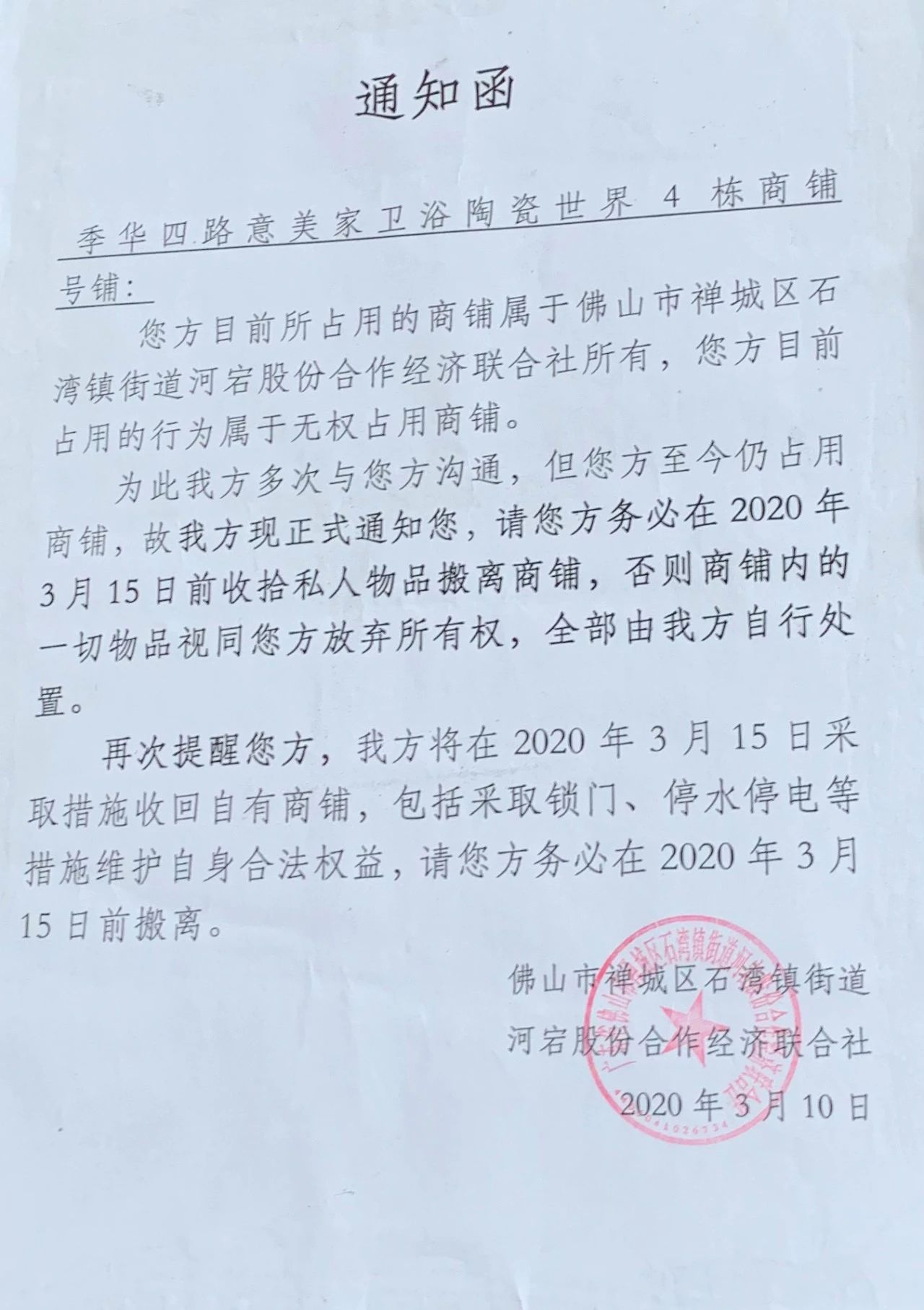 “断水、断电、没收物资要挟卫浴商家5天内搬离”佛山河宕经济合作社下通牒!