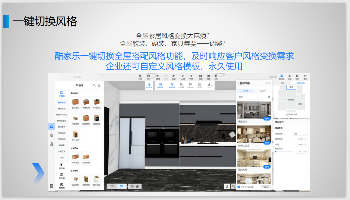 四是一键切换全屋搭配风格,及时响应客户风格变换的需求,帮助客户决策;