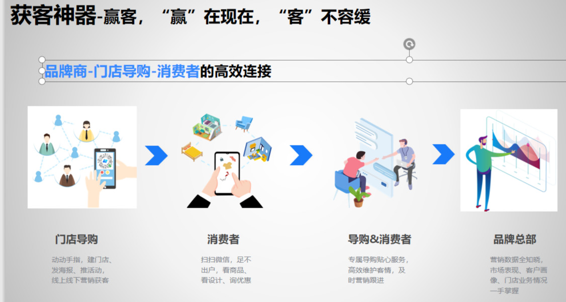赢客项目是大家居行业全链路数字化营销解决方案,可以实现“品牌商、门店导购、消费者”三者之间的高效连接。据真理老师介绍,赢客可以1键分享线上门店、10秒设计全景海报、3分钟创建营销活动、客户动态实时跟进,形成“微信生态——线上营销——顾客管理——数据回流”的营销链路,大力帮助商家快速把拓客、蓄客搬到线上,真正实现“足不出户,线上拓客”。