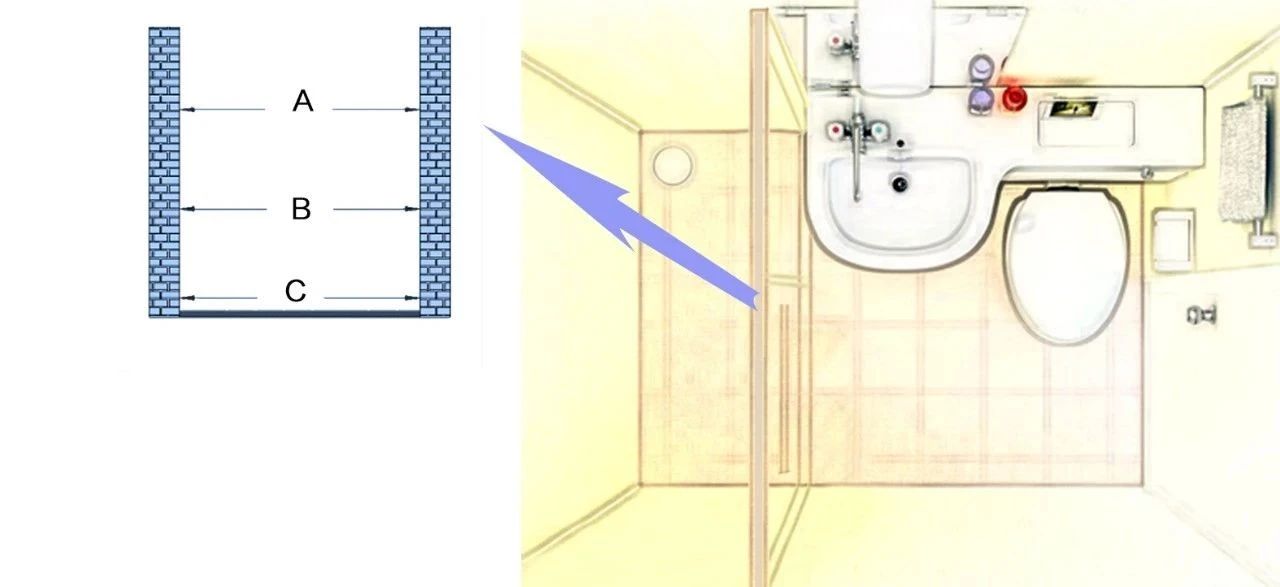 1、屏风一字形:适用于狭长型的浴室空间,将浴室一分为二;需测量下图ABC三个尺寸。