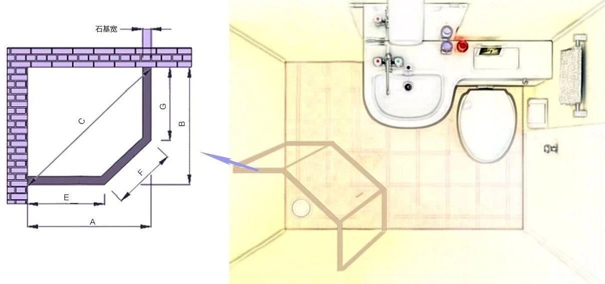 2、扇形:利用浴室的两面直角墙,比较简约,适合不同大小的浴室; 测量图示A、B、C、石基外延长及石基宽度的尺寸。