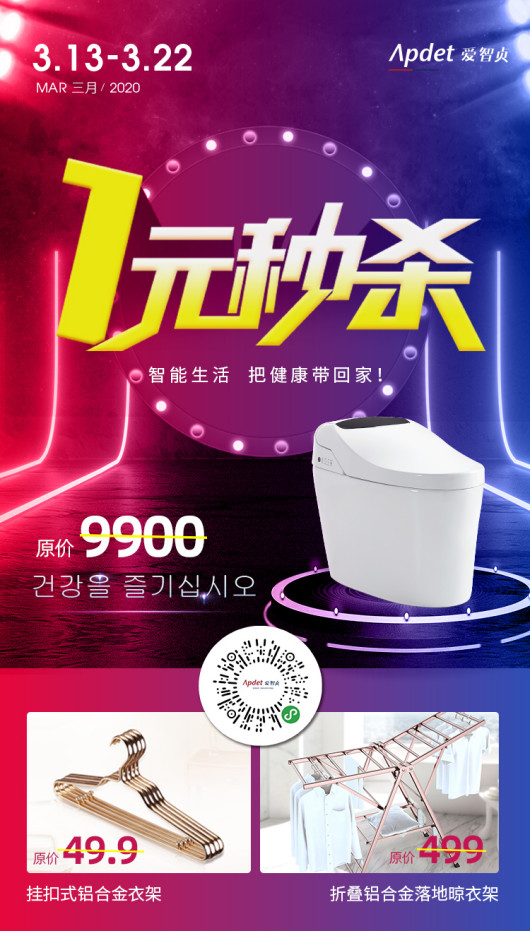 洁净品质,智享生活,爱智贞智能马桶始终坚持以改善人们的卫浴生活品质为使命。在本次优惠促销活动中,不仅设智能新品及系列优惠套餐以惊爆低价感恩回馈,本次活动,由爱智贞公司直接操盘,全品类产品集中参与,打造双重超大好礼!