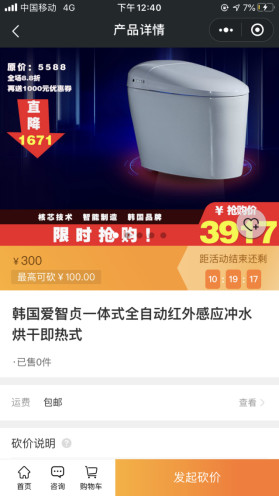 惊喜二:全场一体智能马桶8.8折后,可再用优惠券1000元,交付定金金额可直接设置成为分销佣金,尾款到店支付。