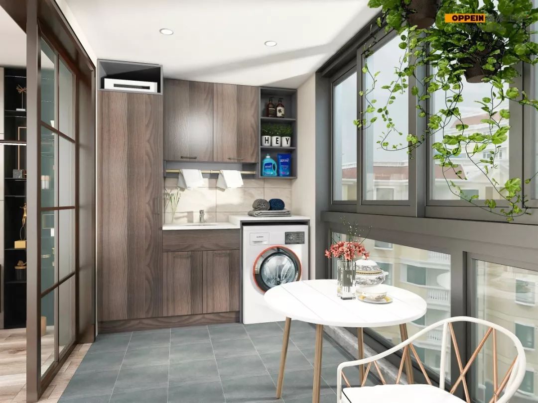 定制阳台柜,配置洗衣机收纳区,将洗衣机保护起来。不用担心洗衣机日晒雨淋,太快老化。