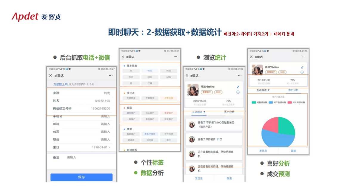 在爱智贞的新零售销售链中,其客户跟进主要通过后台与浏览用户即时聊天,后台智能抓取经过允许的登陆用户的电话信息,便可持续跟进,促进成交。随后,通过小程序精准引流,线上交定,线上报名,最终引导至进店成交。