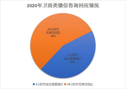 客服咨询方面,只有6家品牌在两个线上渠道可以在1小时内提供信息指引。其中微信公众号的咨询回复有超过一半品牌在24小时内无有效回应。而恒洁卫浴的微信客服几乎做到“秒回”,同时直截了当地提供门店地址和联系方式,而不是很多品牌给到的查询链接。