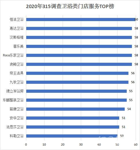 门店调查部分,以店面氛围、设计服务、产品讲解、售后政策、服务态度、持续服务等六个方面作为考核标准,满分为60分。18个品牌中,14个品牌的门店表现优秀,分数均为50分及以上,入围2020年网易家居315服务调查门店服务TOP榜。恒洁卫浴以60分的满分荣登榜首。